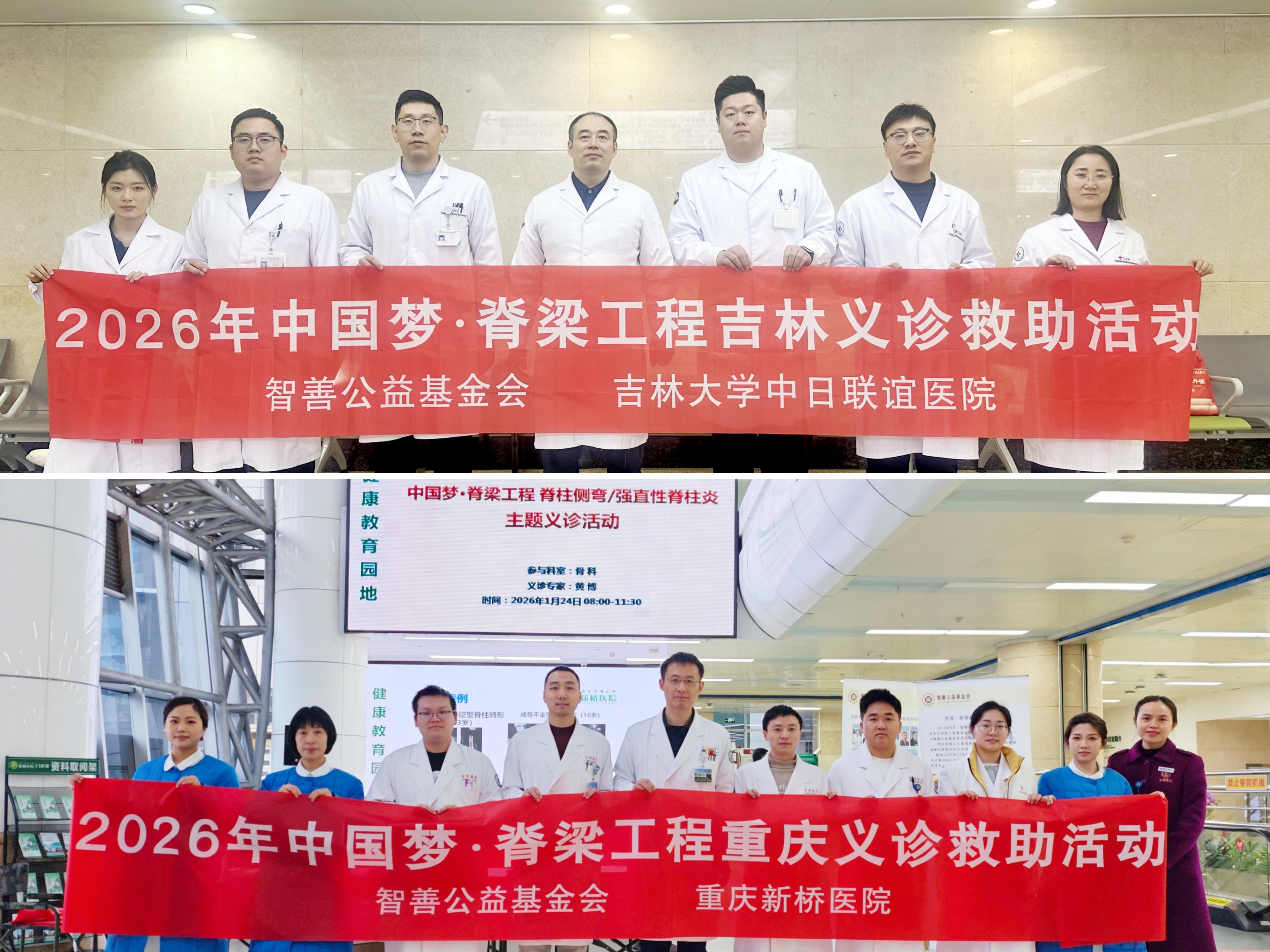 1月24日,2026年首场中国梦·脊梁工程义诊救助活动在吉林、重庆两地同时启动,两位著名脊柱外科专家——吉林大学中日联谊医院北湖院区院长刘鹏教授和重庆新桥医院骨科副主任黄博教授各率团队为脊柱畸形困难患者送温暖。智善公益基金会捐赠了患者的拍片费用。