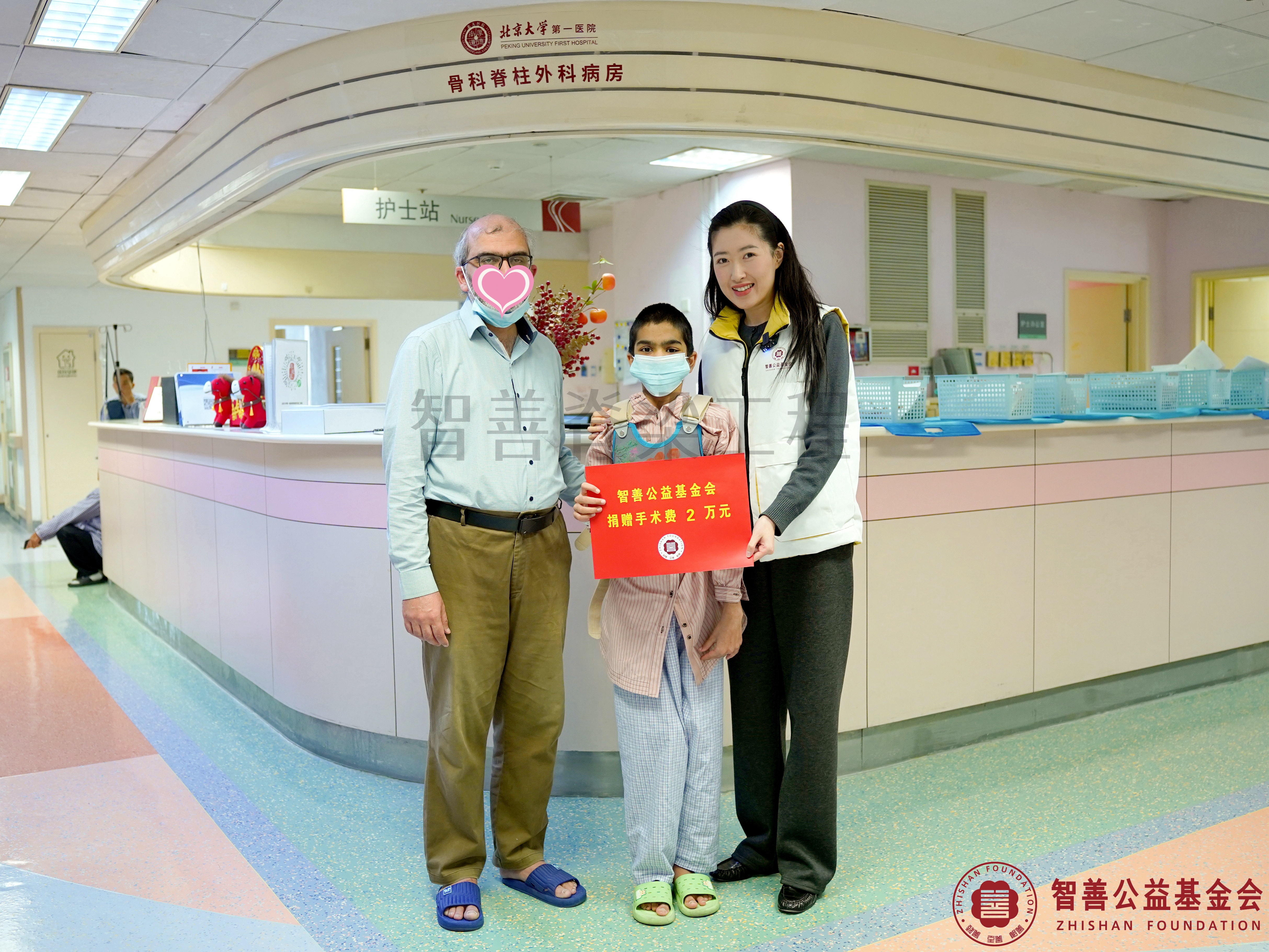 3月22日,北京大学第一医院脊柱外科病房内洋溢着爱的温情。爱心志愿者雨晴将智善公益基金会捐赠的2万元善款转交给在院治疗的巴基斯坦脊柱侧弯患者法提玛,这是智善脊梁工程自2013年创建以来救助的首位外籍患者。
