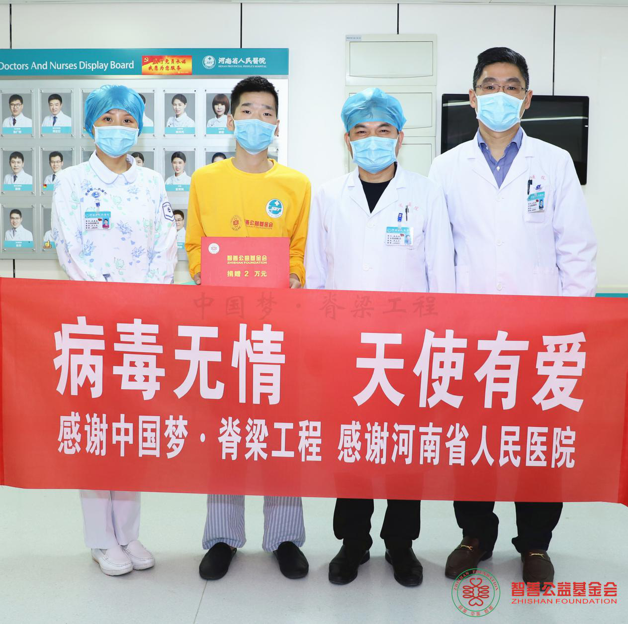 河南省人民医院高延征主任(右二)和苏豫囡护士长(左一)、王红强医生将智善公益基金会捐赠的2万元转交给河南开封兰考县患者小李